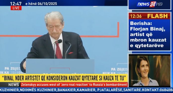 Berisha: Jam sot këtu për t’u informuar ju dhe qytetarët e Tiranës, dhe mbarë Shqipërisë, se midis kandidaturave shumë të mira që kanë ardhur direkt nga drejtues dhe personalitete të PD, tashmë të bëra publike, për të cilat unë kam vlerësimin më të madh, kandidaturave realisht të personaliteteve të pavarura nga fusha të ndryshme, nga Shqipëria dhe nga diaspora, PD duke falënderuar me mirënjohje secilin prej atyre që vendosi të paraqesë kandidaturën e tij në shërbim të qytetarëve të Tiranës dhe përballjen me të keqen e këtij vendi, që është Edi Rama, informon se grupi i mandatuar nga PD do u paraqesë aleatëve tanë mendimin dhe sugjerimin që të mbështesim së bashku artistin e mirënjohur, personalitetin e shquar të artit, luftëtarin e paepur të kauzave të qytetarëve shqiptarë, komunikatorin e talentuar, e lindur, zotin Florjan Binaj.
