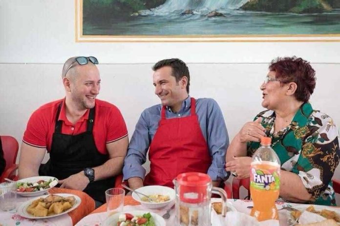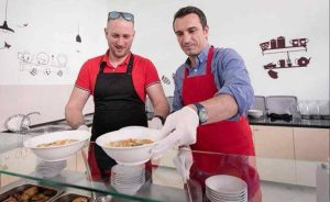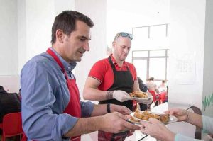 8 prill 2018 – Florian Binaj, bashkë me Erion Veliajn shërbyen drekën e Pashkëve për familjet rome në mensën sociale të Bashkisë së Tiranës.