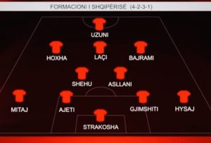 Surpriza nuk ka në portë, mbrojtje apo në mesfushë, por në repartin e sulmit. Ernest Muçi, Armando Broja dhe Anis Mehmeti janë lënë në stol. Ndërkohë që nga minuta e parë në repartin ofensiv e nis treshja, Hoxha, Bajrami dhe Uzuni.